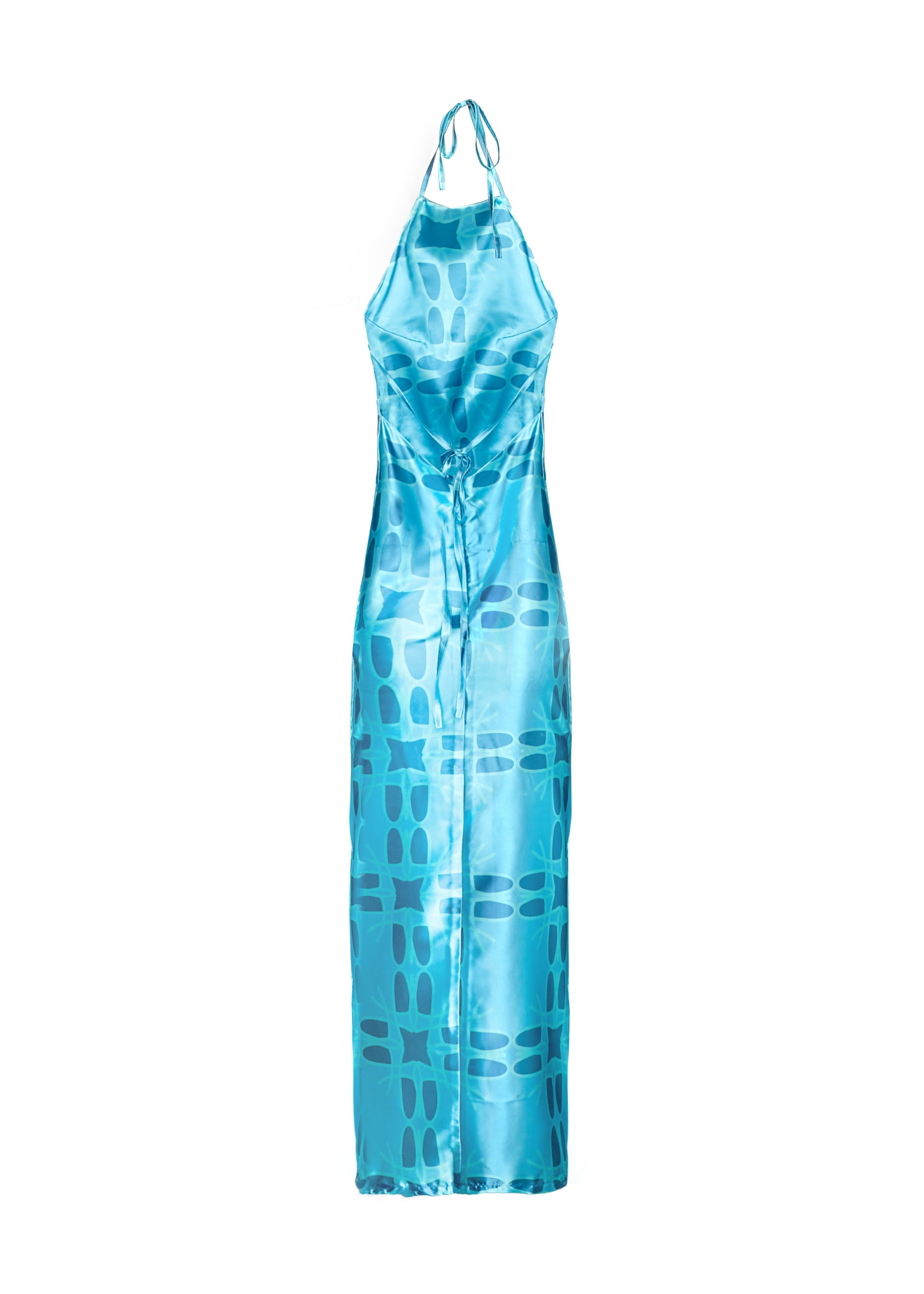 - Open back cut out with neck and back tie straps