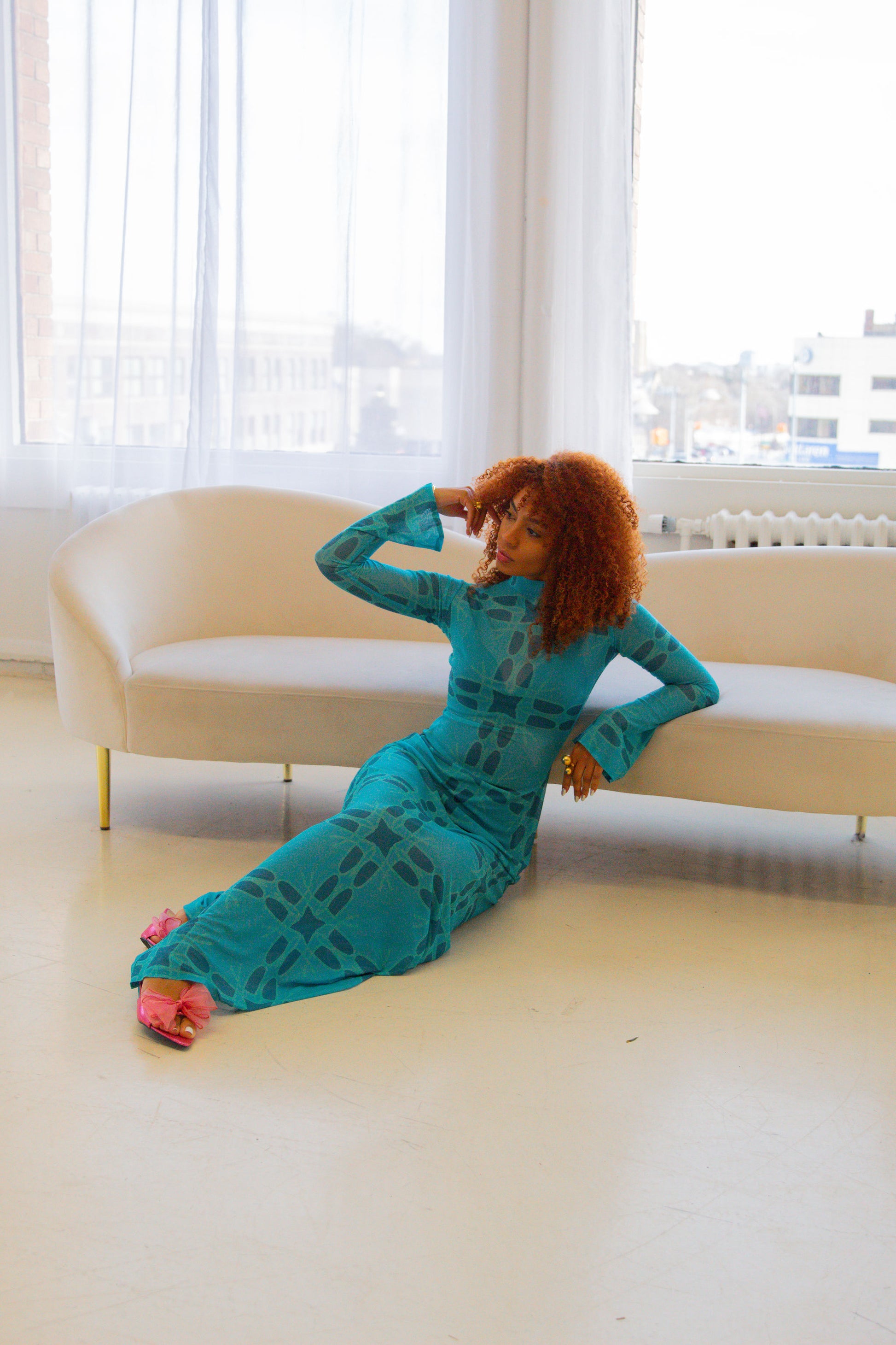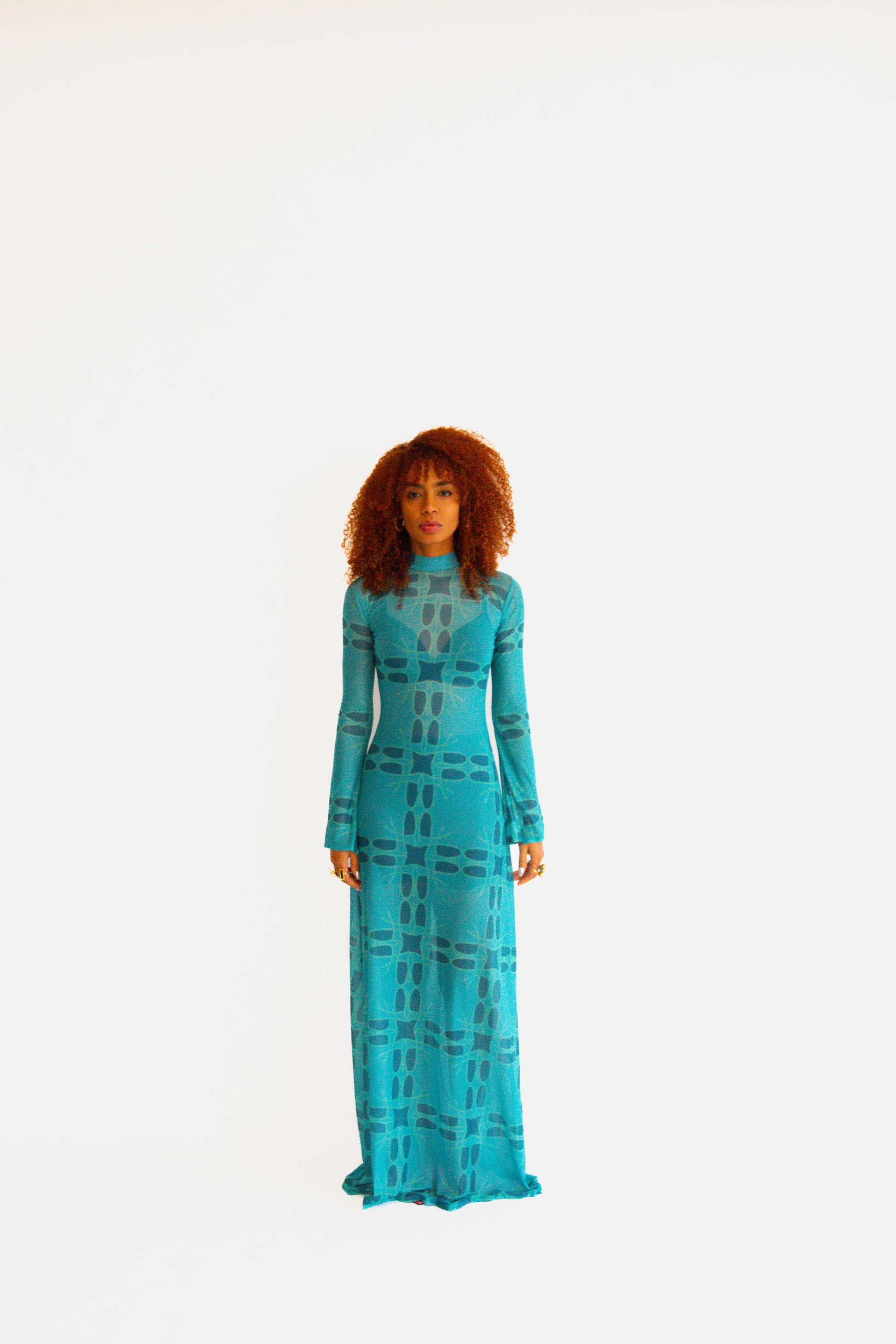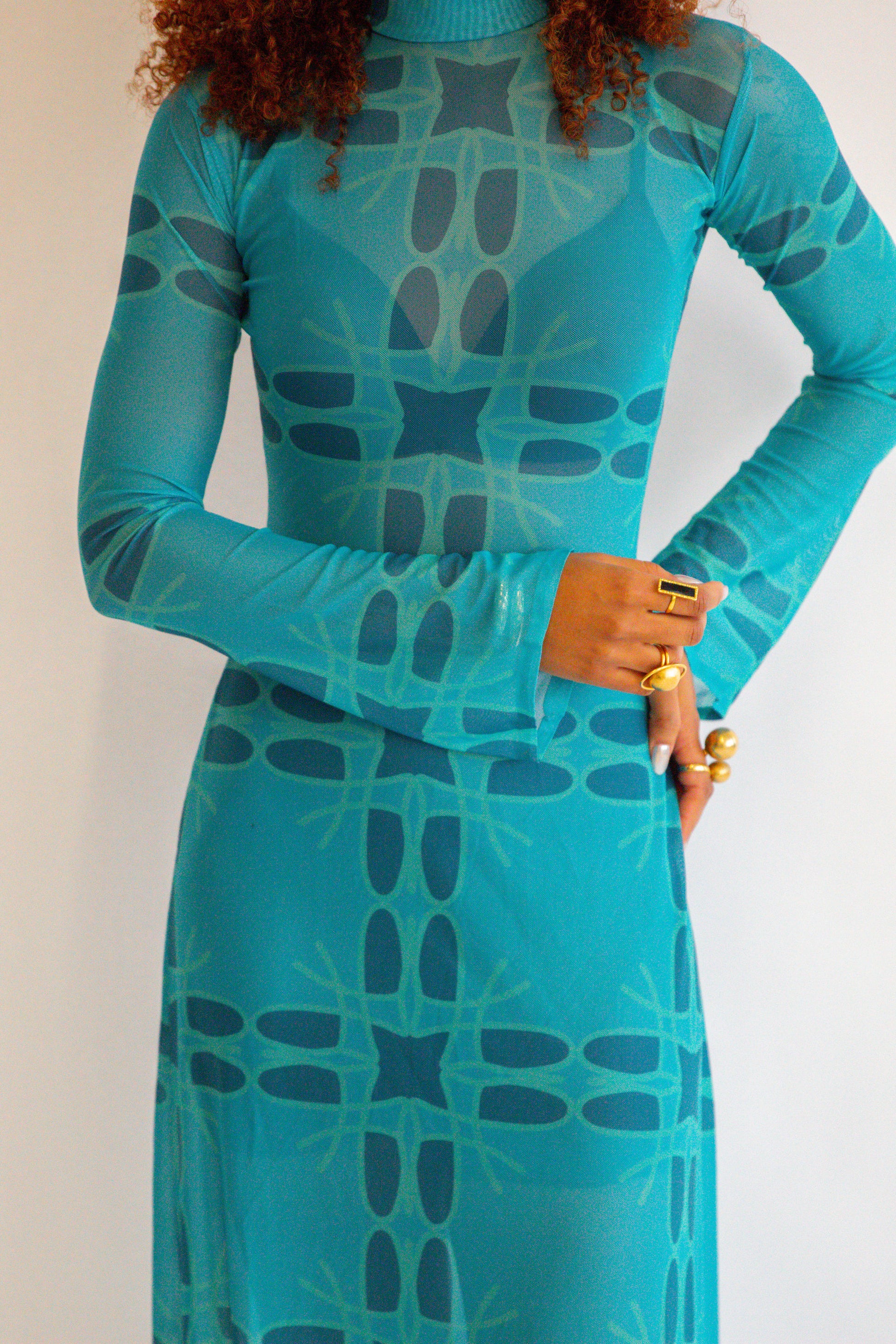Queen Of Waves Teal Long Sleeve Maxi Mesh Dress