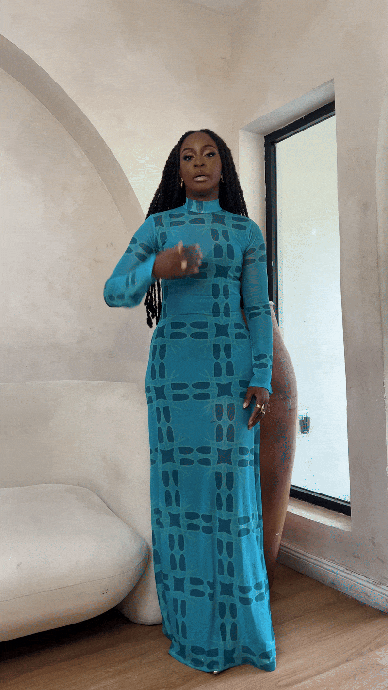Introducing the Queen of Waves Mesh Long Sleeve Maxi Dress in our custom Ease Print.